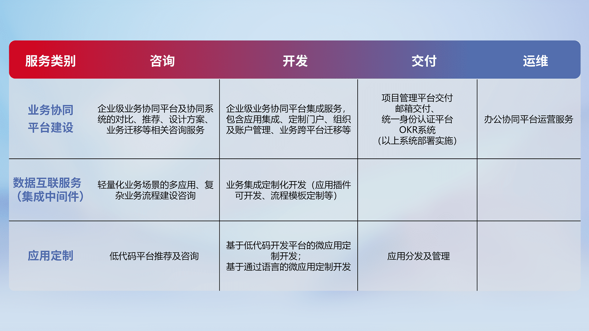 针对钉钉、、企微、、IDaas等平台级产品提供产品的规划、、方案、、交付、、、定制化开发等服务,,实现如统一协同办公、、智能客户服务、、、、混合会议管理、、、、智能数据查询、、、等业务场景,,,实现数字化转型。。